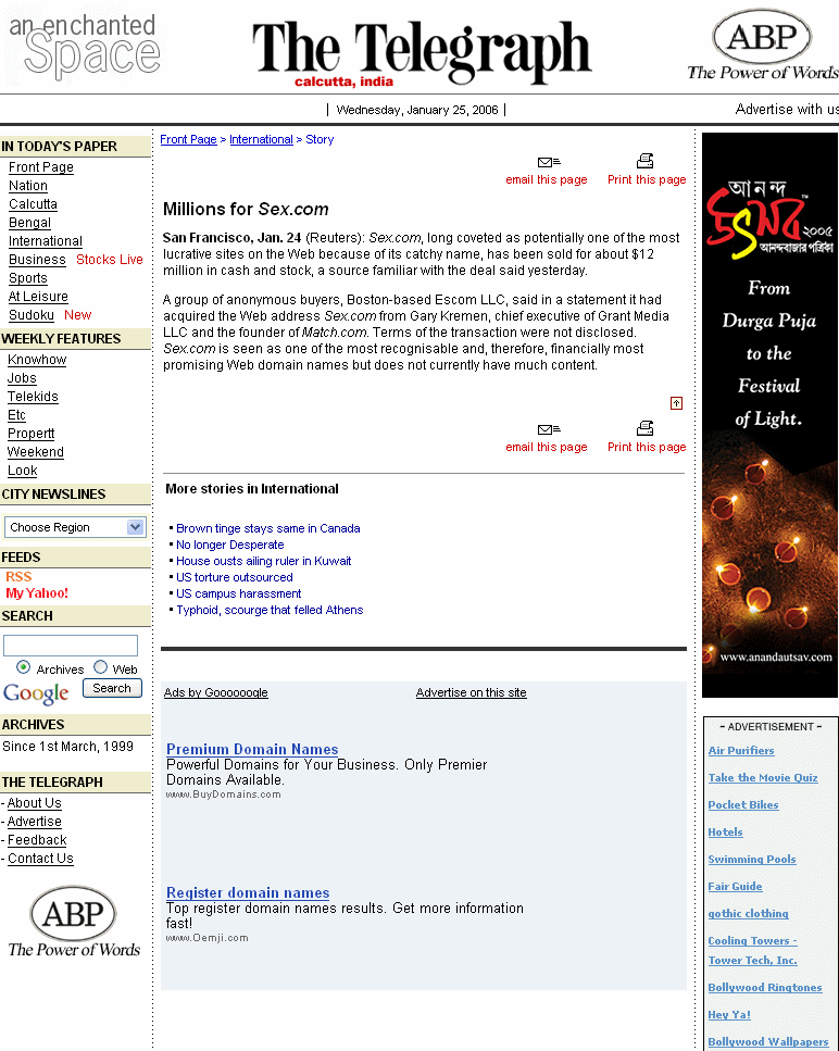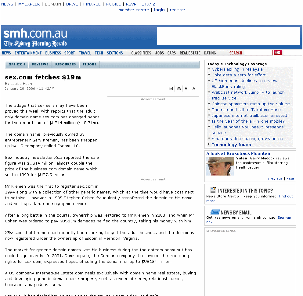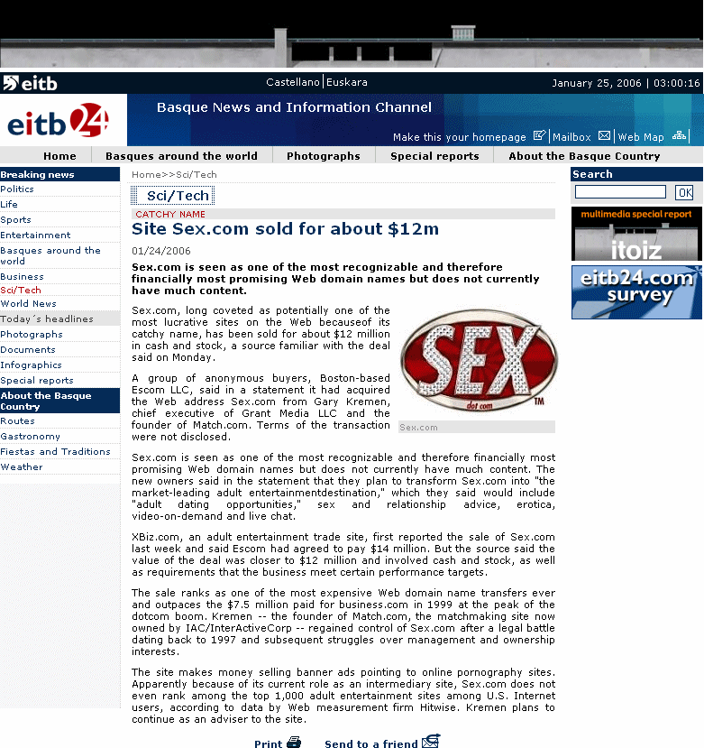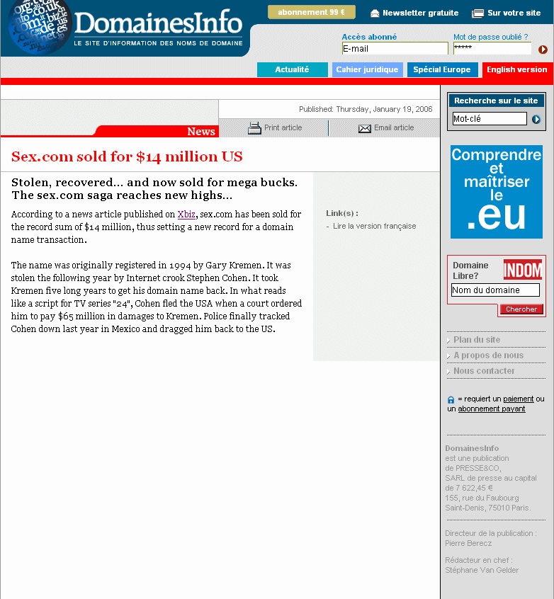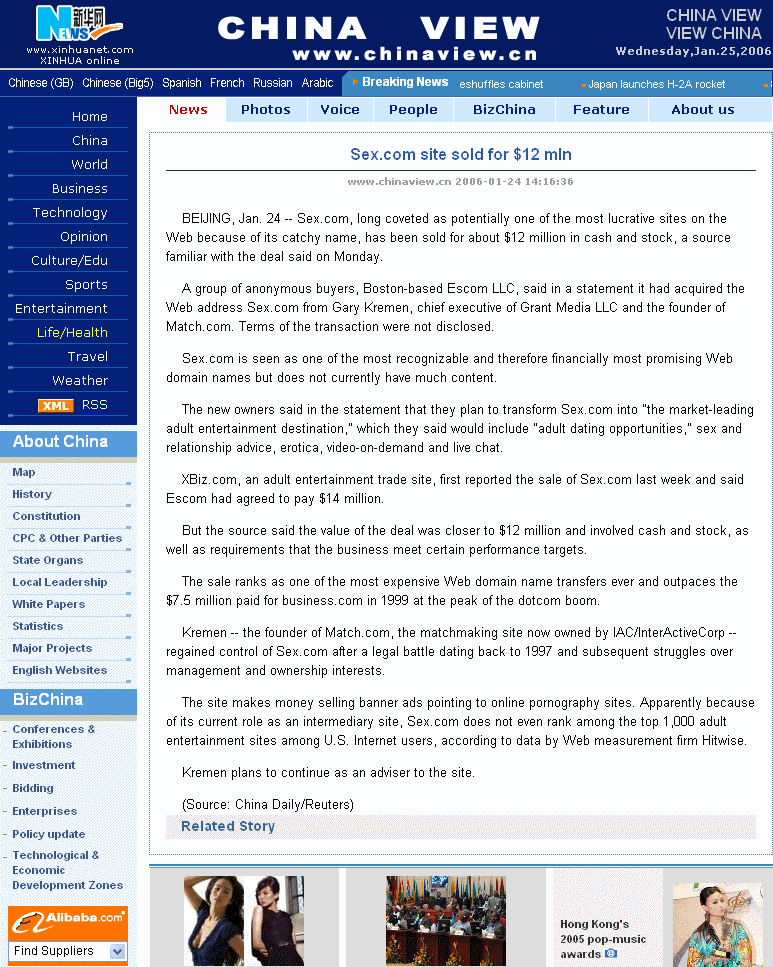 These were some quick screenshots I got from the sale of Sex.com for $12 million (earlier reports reported $14 million as the sale price, later revised to $12 million). There were a lot of headlines around the world that day, on TV, Newspapers, and Radio, and I gathered a few online ones from different countries below. Click on them to enlarge them. Let there be no doubt, when TheRecordBreakingDomain.com breaks Sex.com's record, it will be all over the news across the globe and, due to the circumstances of the sale, will get a lot more attention.